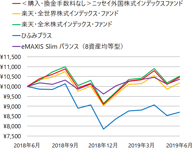 ニッセイ外国株式 楽天 全世界株式 全米株式 ひふみプラス 8資産均等型の2019年6月の月間騰落率と過去1年間の基準価額の推移 Nisaで積立投資手帳
