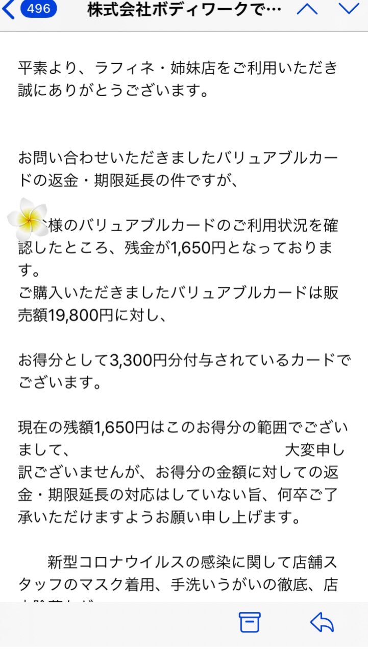 ゆうちゃん On Twitter ラフィネ被害者の会 笑 バリュアブルカード 19800分購入すれば 3300分ついて 23100分の施術代として利用可能になるから購入したのに コロナの影響で休業になって 期限が4 17迄だった残金について問い合わせたらこの対応 これはもはや