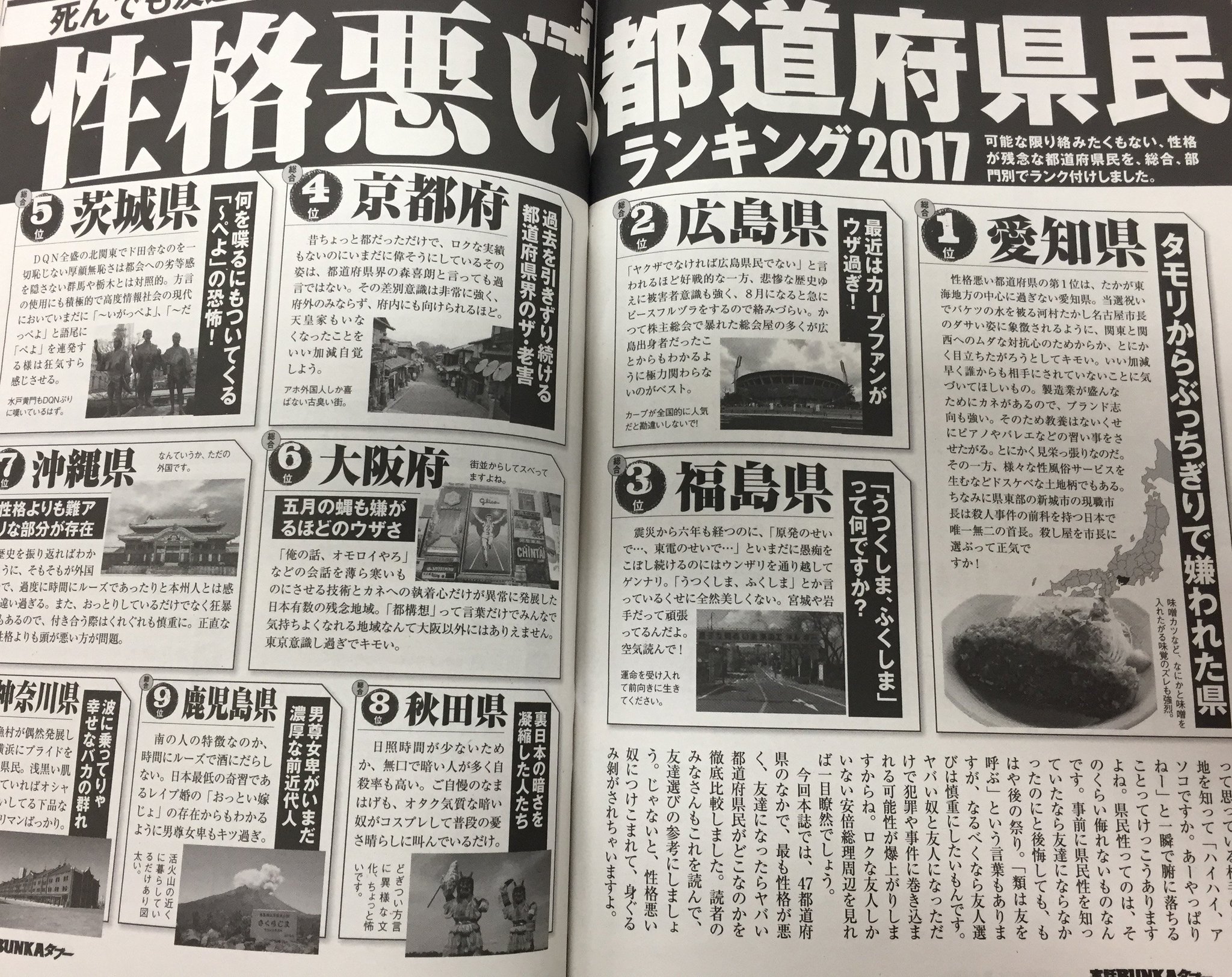 実話bunkaタブー編集部 On Twitter 性格悪い都道府県民ランキング2017 実話bunkaタブー9月号掲載 やっぱり愛知県民 が1位でした あとは広島県民 福島県民と続き 納得のいく順位となってます 県民性が劣ってる人には近づきたくないものですね