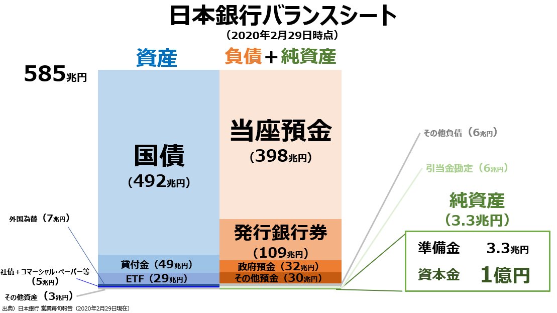 加納裕三 Yuzo Kano در توییتر 日銀のバランスシートを視覚化しました 議論のベースになることを期待しています 国債 日本国債 政府の借金 貸付金 オペで銀行に貸しているお金 Etf 日本の上場株式 当座預金 銀行 証券会社の預金口座 発行銀行券 お札 1万
